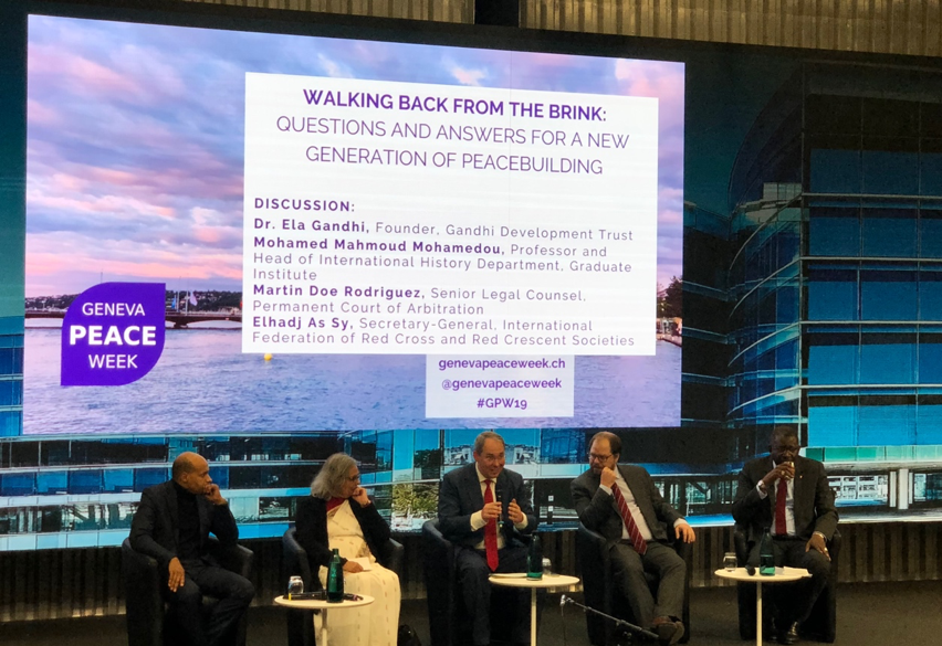 Following those inspiring opening speeches, the ceremony continued to an opening roundtable on the themes of “Peacebuilding in Europe,” “Humanitarian, Human Rights, and Peacebuilding Nexus,” “Peace, Security, and the SDGs,” “Truth and Trust,” and “Business and Peace.” The panel had the presence of Dr. Ela Gandhi, founder of Gandhi Development Trust and granddaughter of Mahatma Gandhi; Mohamed Mahmoud Mohamedou, Professor and Head of International History Department at the Graduate Institute; Martin Doe Rodriguez, Senior Legal Counsel at the Permanent Court of Arbitration; and Elhadj As Sy, Secretary-General of the International Federation of Red Cross and Red Crescent Societies.