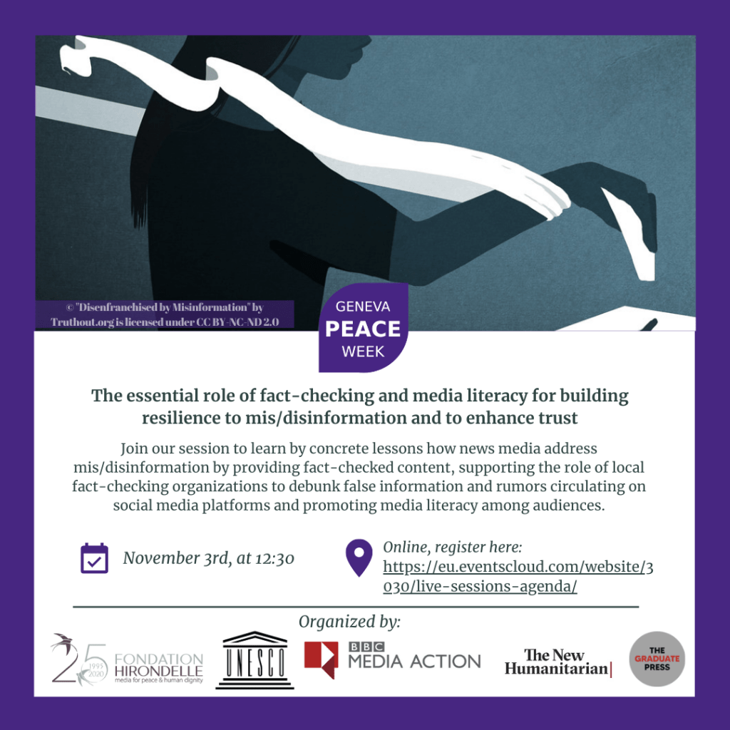 Chaque année, des divers acteurs et institutions du monde entier qui sont engagées dans les domaines de la consolidation de la paix, des droits de l’homme et du développement se réunissent et participent à un forum pour se connecter, explorer et s’informer sur la résolution des conflits, la négociation et la construction de la paix. Ce forum – la Geneva Peace Week – est un événement majeur dans le calendrier de la consolidation de la paix internationale, ainsi que de la Genève internationale. Cette année, il se déroulera entièrement en ligne du 2 au 6 novembre 2020.