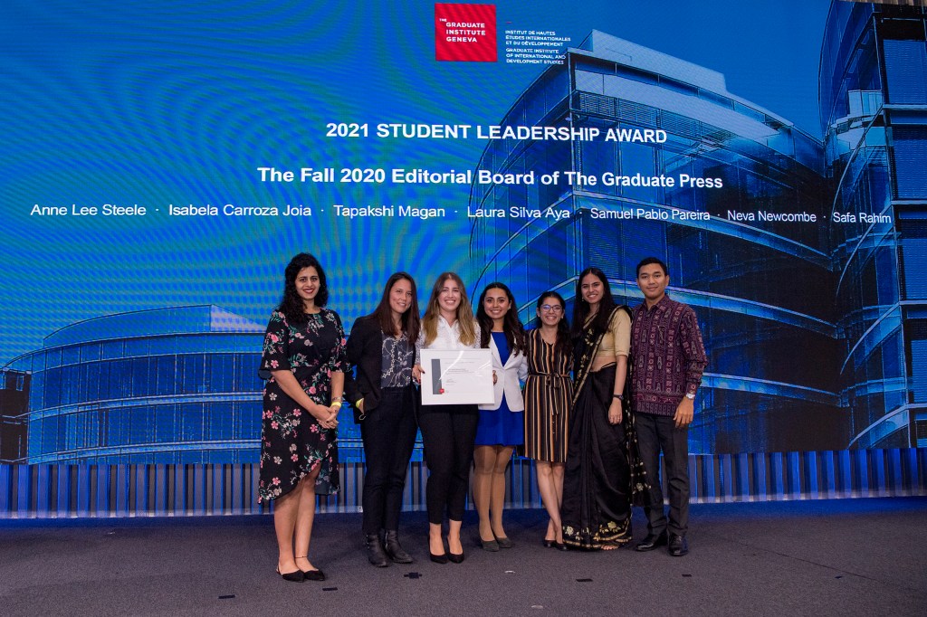 The Graduate Press (TGP) is an independent news source maintained by graduate students at the Institute. This fall, its board members – Anne Lee Steele, Isabela Carrozza Joia, Tapakshi Magan, Laura Silva Aya, Samuel Pablo Pareira, Neva Newcombe and Safa Rahim – were honoured with the 2021 Student Leadership Award for their hard work and dedication to bringing student voices to the fore.