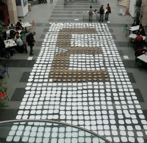 Puis, toujours dans le cadre de ces négociations, les étudiants ont eu l’idée de coller des centaines d’assiettes au sol afin de représenter symboliquement le chiffre “3”, prix souhaité des repas revendiqués.