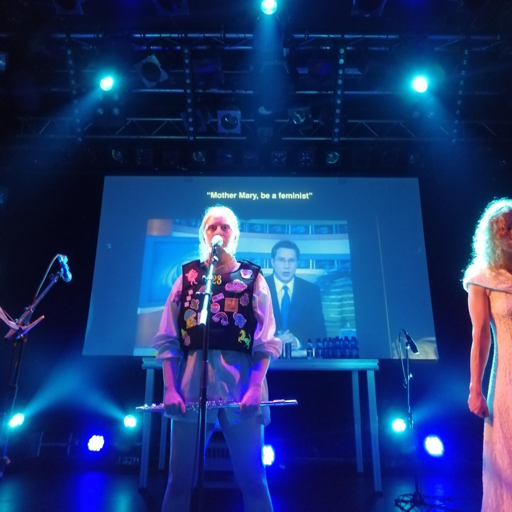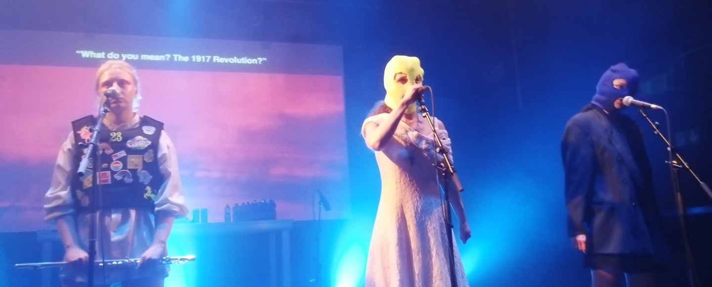 The first part of the concert was precisely about that: Pussy Riot’s illegal show in Moscow’s cathedral, Alyokhina’s jail time and escape. It continued with a criticism of the Russian Orthodox Church, its head Patriarch Kirill of Moscow, and Putin’s links with the institution and the Patriarch, both former KGB colleagues. At some point, the four members knelt in front of the audience in a cynical prayer to Mary: “Virgin Mary, Mother of God, banish Putin!”, “Mother Mary, be a feminist”. The show went on, in a sequence of songs in Russian, with English subtitles on a screen in the back, bearing criticism of Putin’s regime, the patriarchal system, Russian oligarchs corruption, nationalism and war.
