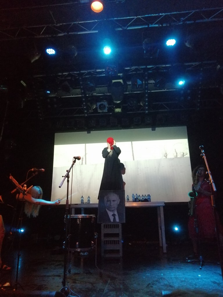 The climax of the show was reached when the clearest of the messages was blatantly sent. As a big painting of Putin’s face was brought on the stage, a member of the group, wearing a long black dress and a balaclava climbed on a table behind the portrait, lifted her dress and urinated on Putin’s face.
