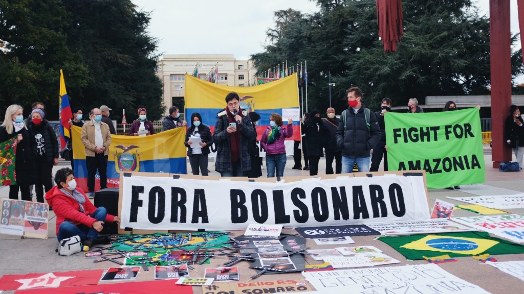 At Places des Nations, in Geneva, protesters gathered to call out Bolsonaro’s environmental policies.