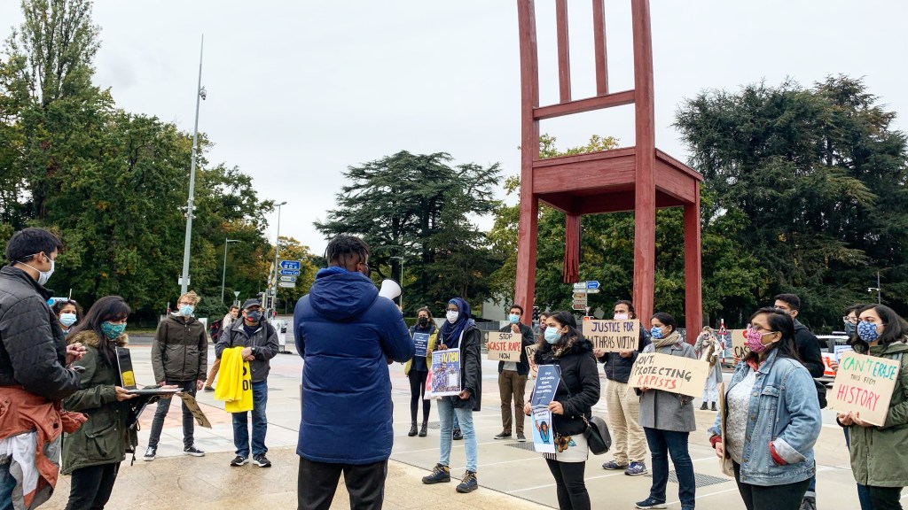 On 10 October 2020, students from The Graduate Institute, Geneva assembled by the Broken Chair in front of Palais des Nations to protest against the gang rape by four upper caste Thakur men of a 19-year old Dalit woman in the Hathras district of Uttar Pradesh(UP).